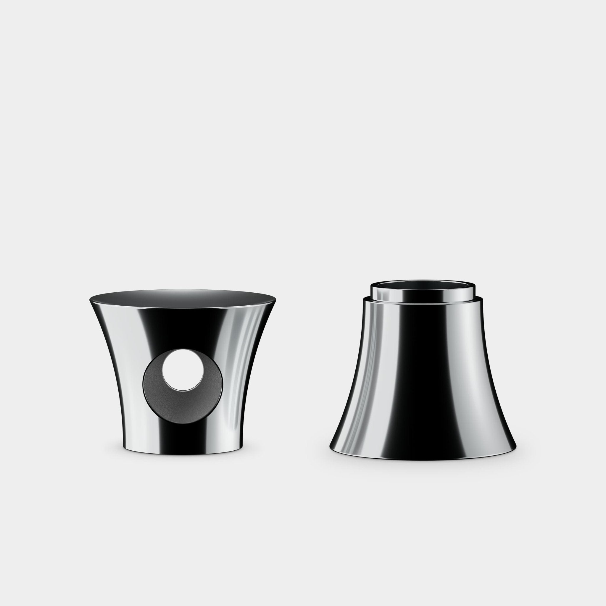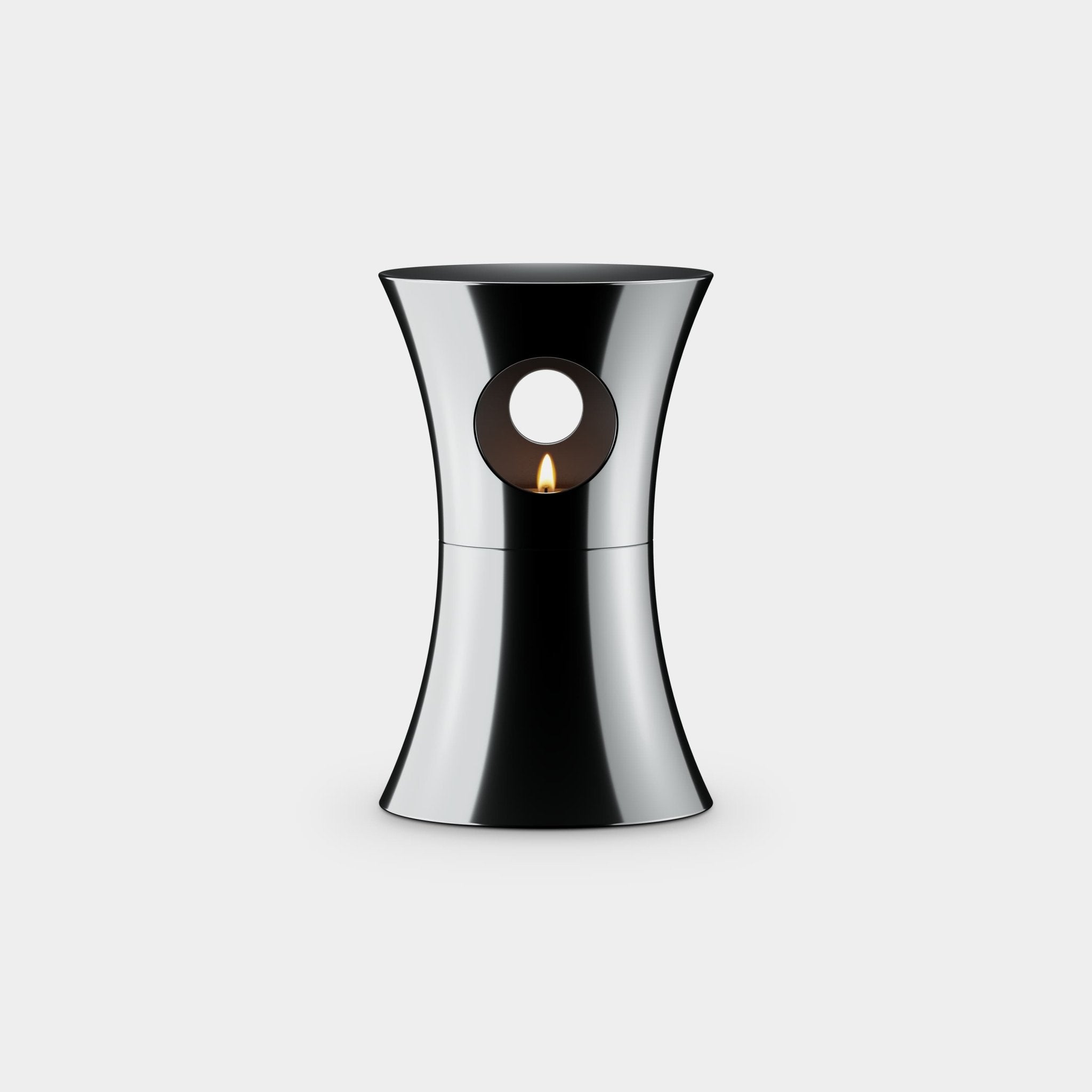 A solid stainless steel oil burner designed to diffuse scent through steady heat. Essential oils can be added to the top concave top surface, while a standard tea light provides warmth from below. The material retains warmth and reflects soft light as it burns.