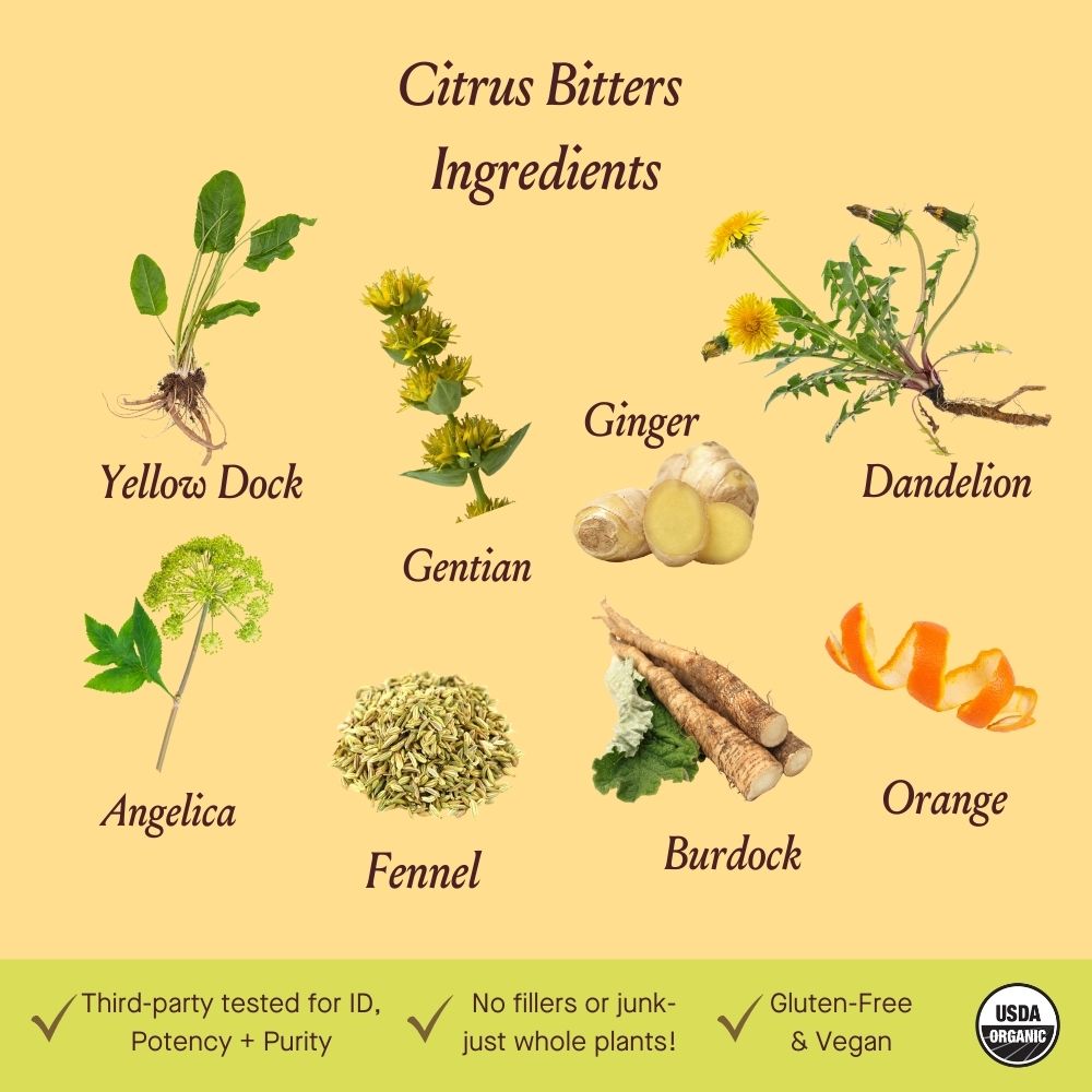 Mezcla patentada de extractos de hierbas orgánicas: raíz de diente de león orgánica, hoja de diente de león orgánica, raíz de bardana orgánica, cáscara de naranja orgánica, semilla de hinojo orgánica, raíz de acedera amarilla orgánica, raíz de angélica orgánica, raíz de genciana orgánica, raíz de jengibre orgánica.